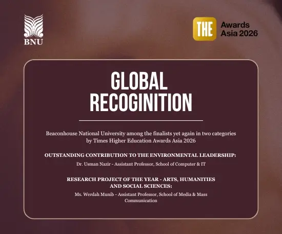 In another remarkable achievement for Beaconhouse National University, Ms. Werdah Munib has been shortlisted for the Times Higher Education Awards Asia 2026 under the “Research Project of the Year (Arts, Humanities, and Social Sciences)” category. She stands among Asia’s top eight finalists, selected from hundreds of institutional entries across the region.